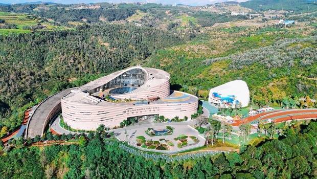 r群山环抱、绿意盎然,氤氲的雾气缭绕林间,在华宁象鼻温泉度假村内,搭客们正享受着温泉带来的酣畅。