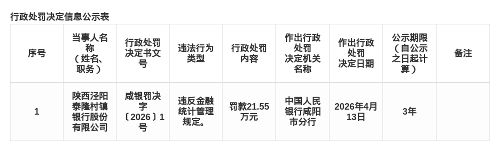 蓝鲸新闻4月20日讯,近日,中国东谈主民银行咸阳市分行发布了一张罚单,剑指陕西泾阳泰隆村镇银行股份有限公司。