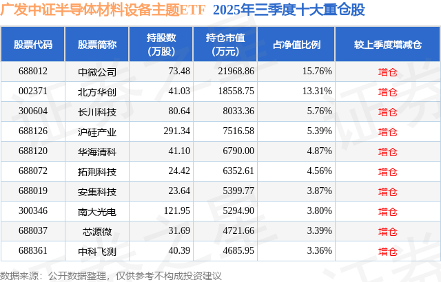 从基金鸿沟来看,广发中证半导体材料诱惑主题ETF基金2025年三季度公布的基金鸿沟为13.94亿元,较上一期鸿沟1.91亿元变化了12.04亿元,环比变化了631.75%。该基金最新一期钞票建立为:股票占净值比99.68%,无债券类钞票,现款占净值比1.89%。从基金握仓来看,该基金当季前十大股票仓位达64.07%,第一大重仓股为中微公司(688012),握仓占比为15.76%。